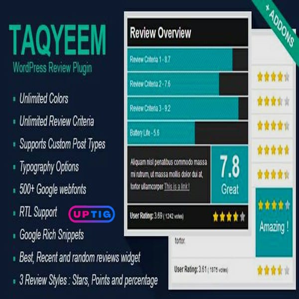 Taqyeem Plugin Free Download is a premium reviewing and ranking WordPress plugin … This plugin was constructed for including pretty scores and evaluations to your posts, pages, and customized submit sorts. Use the customization choices to create the proper ranking addition to your web site. Change the fonts, picture, colours, model, and naturally the standards.